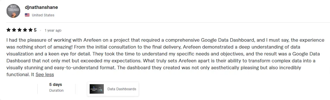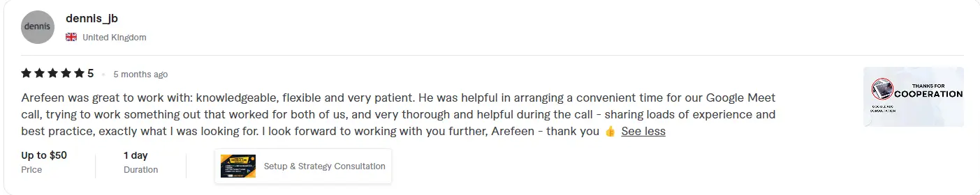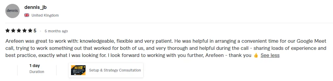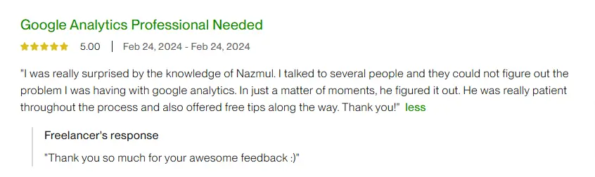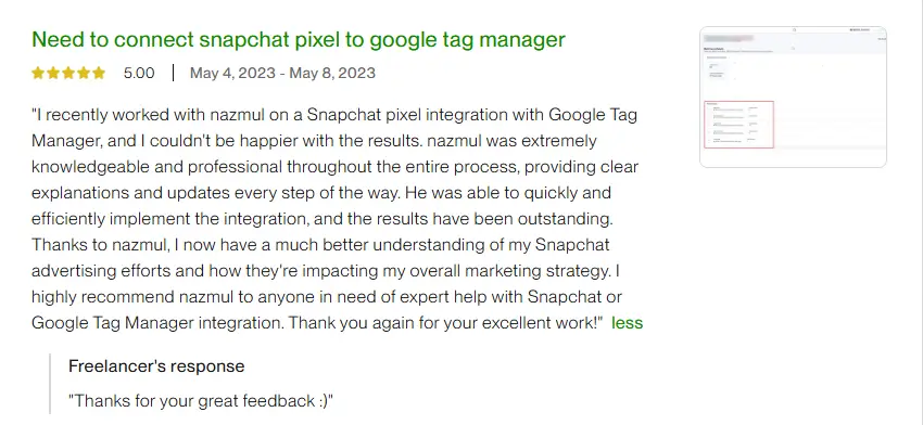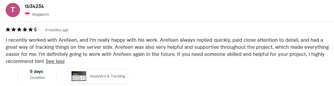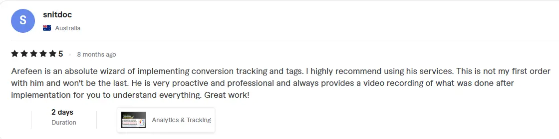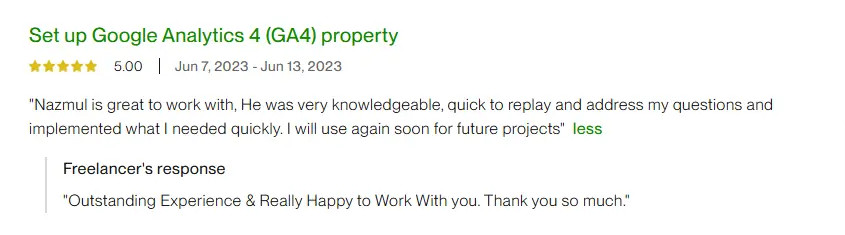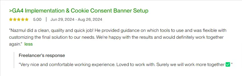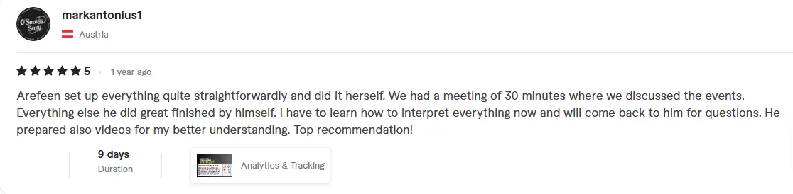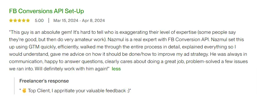 I'm thrilled to share a 5-star review for Nazmul who took care of all our tracking setup for paid ads, Google Tag, GA4, and more. His expertise and meticulous attention to detail truly impressed us. From the very beginning, he understood our requirements and tailored the tracking solution perfectly to meet our needs. Not only did he flawlessly set everything up, but he also provided valuable insights to optimize our campaigns. Throughout the process, his communication was excellent, keeping us informed every step of the way. We are absolutely delighted with the results and highly recommend their services to anyone in need of a skilled tracking specialist. He went above and beyond, and we couldn't be happier with their work!
